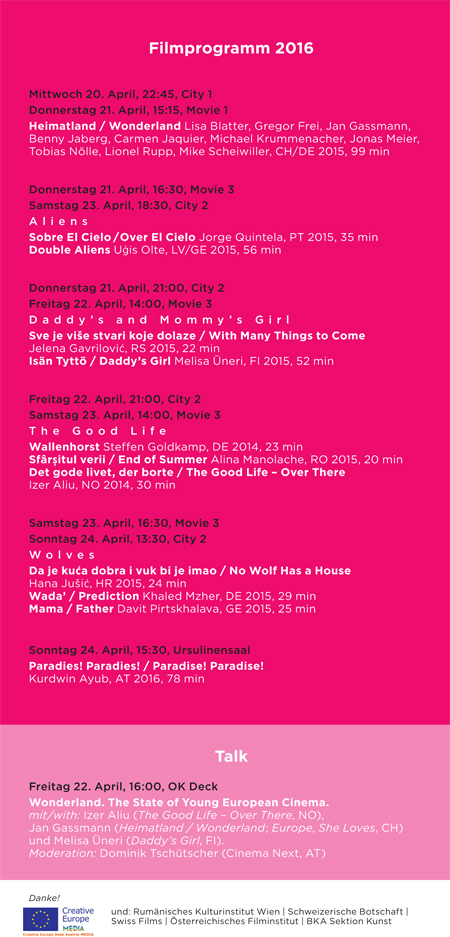 Wonderland ist auch der Titel einer das Filmprogramm begleitenden Podiumsveranstaltung, bei der 3 RegisseurInnen der Sektion über the State of Young European Cinema diskutieren werden.
