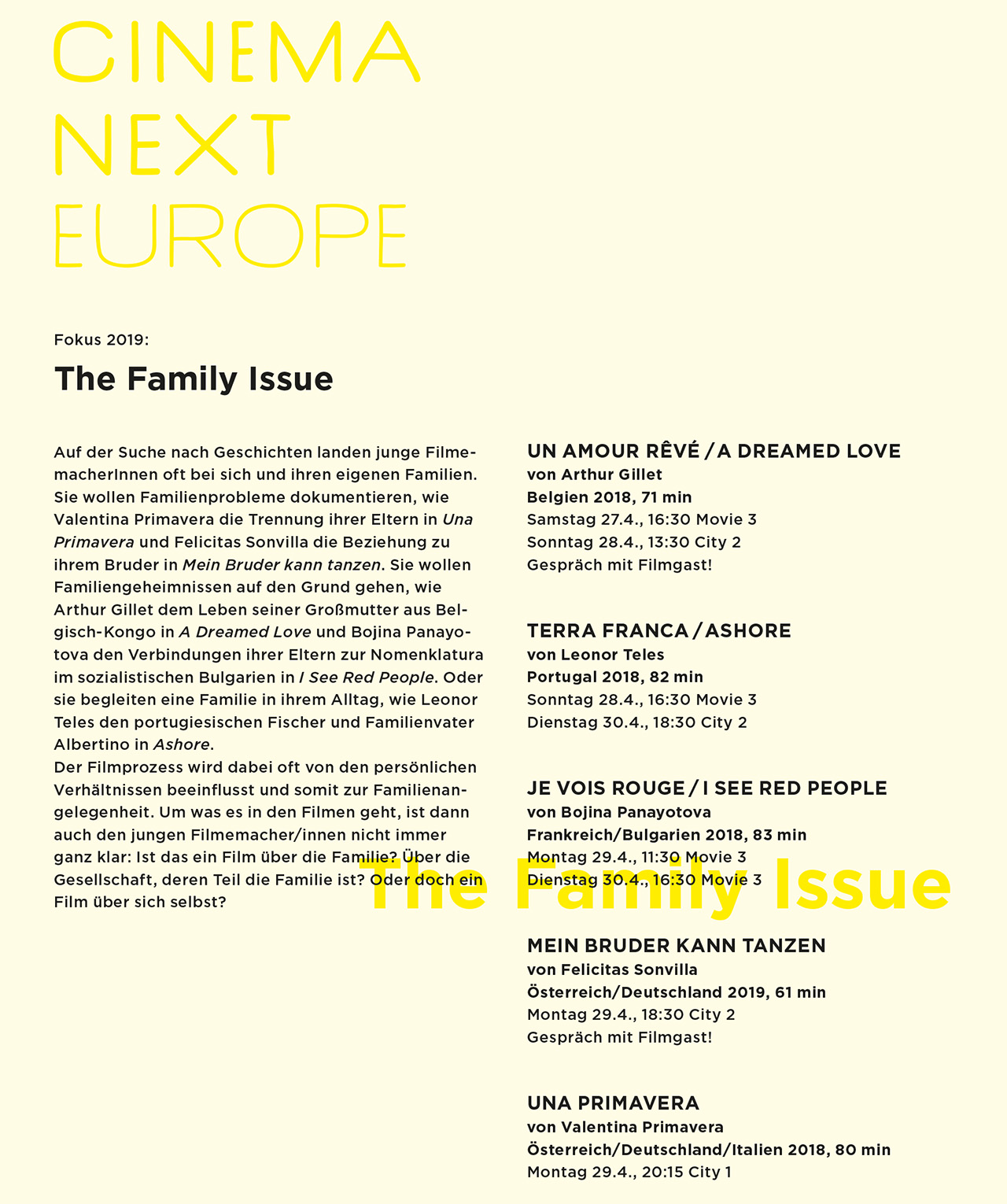 In collaboration withCrossing Europe Film Festival Linz we present the fifth edition of our program scheme for young and emerging filmmaking in Europe:Cinema Next Europe. This year we were focussing on documentary films about families: The Family Issue.