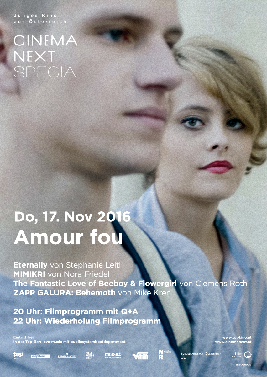 Ein Kurzfilmprogramm, das von ver- und entrückter Liebe erzählt. In Eternally, der ersten narrativen Regiearbeit von Kamerafrau Stephanie Leitl, verliert sich eine junge Frau in ihren Erinnerungen an eine einst starke Liebesbeziehung. Die zwei Teenager in MIMIKRI von Nora Friedel müssen die Liebe erst noch finden: Sie wollen die wilde Nacht, finden aber nur den sanften Sturm und Drang. Ebenfalls Fantasie, aber einer etwas anderen Art, ist die Liebe im humorvollen The Fantastic Love of Beeboy & Flowergirl von Clemens Roth. Ob das Blumenmädchen und der Bienenjunge jemals zusammenfinden? Ein kurioses Date zeigt uns auch Mike Kren in seinem neuen Musikvideo: auch Staubsauger- und Rasenmäherroboter können lieben!