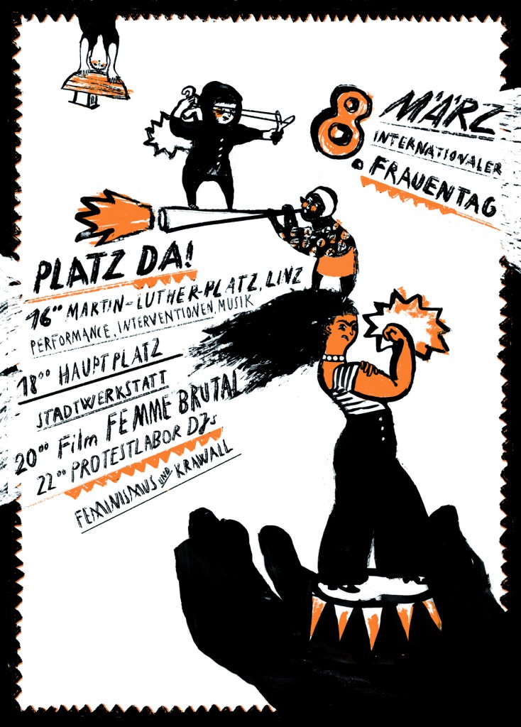 Zum Internationalen Frauentag werden unter dem Titel Feminismus & Krawall an verschiedenen Plätzen in der Linzer Innenstadt musikalische, akustische und performative Aktionen für Frauenrechte stattfinden. Passend dazu wird am Abend in der Stadtwerkstatt der Performance-Film FEMME BRUTAL zu sehen sein. Katharina Riedler (Crossing Europe, this human world) wird das Screening einführen.