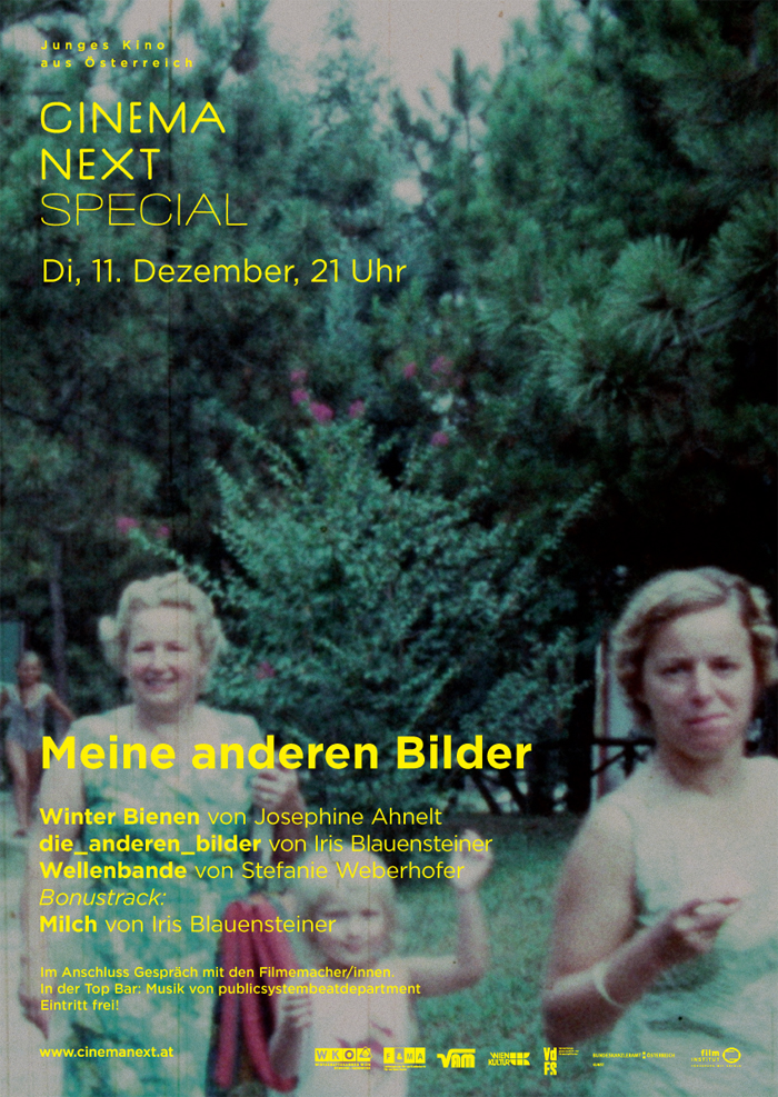 Drei Filmemacherinnen wühlen in ihren persönlichen Bild-Archiven: Stefanie Weberhofer holt in Wellenbande Super8-Material, das auf dem Dachboden der Familie schlummerte, hervor, lässt dieses auf neu gedrehtes Material treffen und schafft so eine Familienzusammenführung in Filmform. Josephine Ahnelt verarbeitet ihr Jahr in Japan in rätselhaften Bildern und kreiert mit Winter Bienen ein neues intimes Tagebuch. Iris Blauensteiner öffnet eine alte Festplatte eines Filmprojekts, das sie vor 10 Jahren realisierte, und macht aus den dort versammelten, kaum noch lesbaren Dateien einen anderen, neuen Film: die_anderen_bilder. Im Anschluss wird der "Ursprungsfilm" gezeigt, auf den sich ihr Film bezieht: Milch.