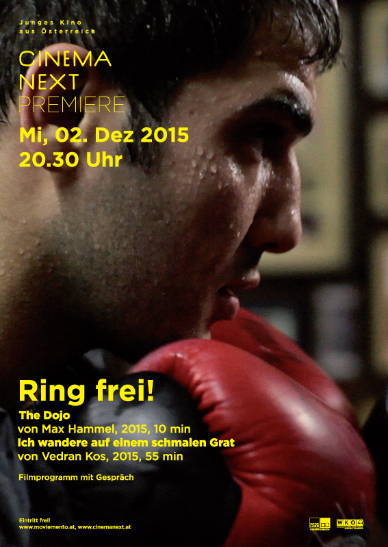 „Wer kämpft, kann verlieren. Wer nicht kämpft – hat schon verloren!“ Ob die Protagonisten der beiden „Boxer-Filme“, die in dieser Cinema Next Premiere präsentiert werden, ihre Kämpfe gewinnen oder verlieren, wird hier nicht verraten. Im Kurzspielfilm The Dojo vom oberösterreichischen Jungfilmer Max Hammel werden Kämpfer im Dojo, einem Ort des Kampfes, in dem keine Gesetze und Regeln der äußeren Welt gelten, als Gefangene gehalten. Yu wird vom Großmeister zu einem Kampf um Leben oder Tod herausgefordert. Im Dokumentarfilm Ich wandere auf einem schmalen Grat kämpft Ibo vor allem mit seinem inneren Schweinehund. Kann er trotz des harten Trainings, den privaten Sorgen und der Angst vor dem Versagen seinen ersten großen Kampf gewinnen? Regisseur Vedran Kos hat seinen Protagonisten ein halbes Jahr bei den Vorbereitungen mit der Kamera begleitet, Cutter Sebastian Schreiner, ebenfalls Oberösterreicher, die Aufnahmen zu einem eindringlichen Sportlerportrait montiert.