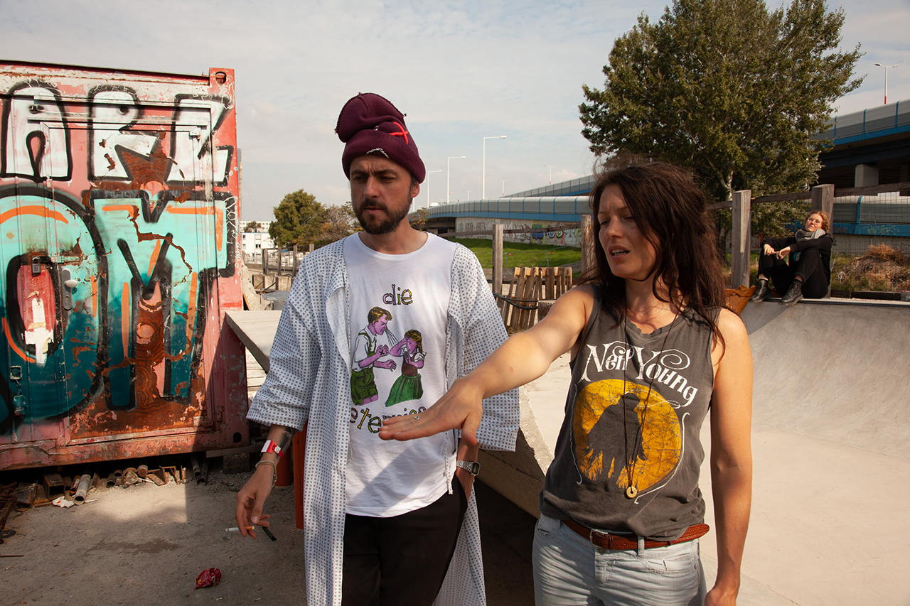 Sowohl im Drehbuch als auch in den Probeaufnahmen gab es schon immer eine Mischung aus digitalen Bildern und wilden, aus der Hand gedrehten Mini-DV-Aufnahmen, die die Schauspieler*innen gegenseitig von sich machten, um sich besser kennenzulernen. Was für Hannes zunächst eine Koketterie mit amerikanischen Skaterfilmen war, entpuppte sich für Marianne plötzlich als die Ästhetik, die der Film brauchte: „Bei diesen Bildern spürte ich viel mehr. Der Film muss so sein, dass man ihn anschaut und das Gefühl hat, man ist mit dabei und erlebt das mit den Figuren.“ Mit dem Gedanken, einfach auf Mini-DV zu drehen, falls keine weiteren Förderungen kommen sollten, brachte Marianne neuen Wind in das Projekt und die Energie im Team zurück. Hannes erinnert sich: „Als wir wussten, dass wir keine Kohle haben werden, haben mir Tinka Fürst, Valerie Pachner, Max Bogner und Voodoo Jürgens geschrieben: ‚We don’t need money, baby. We love cheap thrills!’ Marianne und diese vier haben mich eigentlich angestoßen, das jetzt einfach zu machen. Und dann haben wir das runtergerotzt in zehn, zwölf Tagen.“