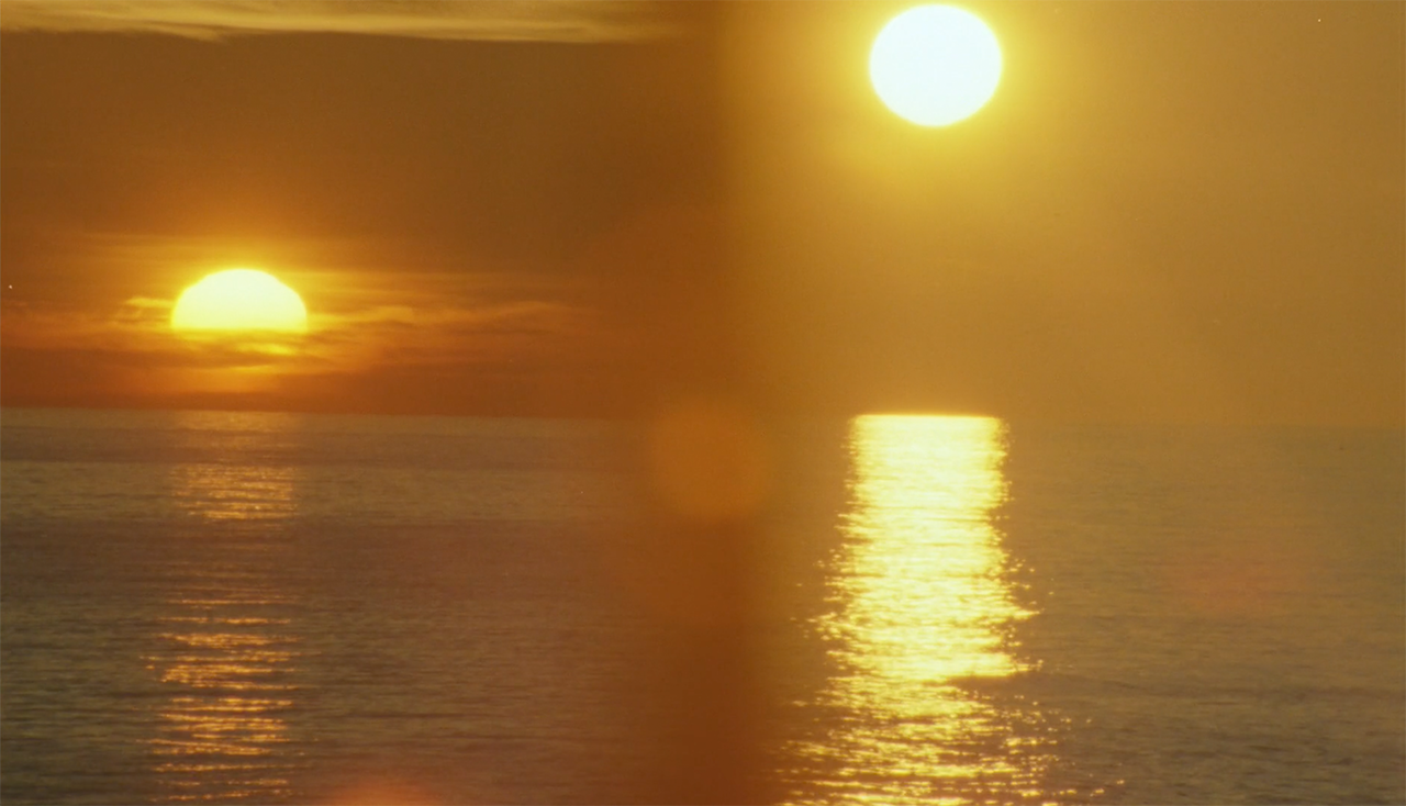 Wenn die Frage aufkommt, was den Film von anderen Kunstformen unterscheidet, fällt das Augenmerk oft auf das Werkzeug der filmischen Montage. Gewöhnlicherweise findet diese Montage von einem Bild zum nächsten in einer zeitlichen Abfolge statt. Zuerst sehen wir ein Bild und dann darauffolgend das andere. In Antonia de la Luz Kašiks Sonnenfilm sehen wir eine Montage der anderen Art: zwei Bilder (oder zwei Halbbilder?) nebeneinander. Eine Gegenüberstellung desselben Motivs: die Sonne über dem Meer. In der linken Hälfte des Bildes sehen wir einen Sonnenaufgang. Der Himmel ist zuerst rötlich, die Sonne dunkel und orange. Nach etwas mehr als einer Viertelstunde ist der Himmel gelb, die Sonne selbst sehen wir nicht mehr, sie ist über den oberen Bildrand gestiegen. In der rechten Hälfte des Bildes sehen wir die Gegenbewegung dazu: Die Sonne sinkt und aus Gelb wird Rot. Die Aufteilung beider Filmhälften passiert nicht durch einen digitalen Split-Screen, sondern ist ein erkennbar analoger Effekt (die Linie bewegt sich auch leicht über den Zeitraum des Films). Die Einstellung wird gehalten, manchmal fliegt ein Vogel durch das Bild, einmal sehen wir einen Menschen. Doch diese einfache Gegenüberstellung zweier Bilder im selben Bild macht aus einem Film, den man sicher auch als “einfach” bezeichnen könnte, etwas genuin Filmisches und Komplexes. Man kann nur staunen, wie ein wunderschönes, natürliches, aber alltägliches Phänomen gefilmt wird. Es ist mehr als die Summe seiner Einzelteile. Dieser Film könnte nicht in ein anderes Medium übersetzt werden, er kann nur als Film existieren.