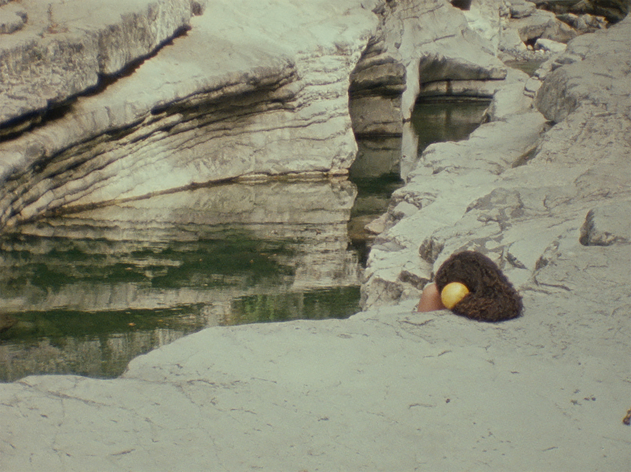 Wir sehen eine karge Landschaft aus Steinen in starren Einstellungen. Zwischen ihnen zieht sich ein Fluss. Dann plötzlich: ein Schopf Haare, die Andeutung eines (weiblichen) Körpers, der in dieser Landschaft in Szene gesetzt wird. Im Laufe des Films werden noch die folgenden Elemente eingeführt: einige gelb-goldene Kugeln (es sind nie mehr als drei im selben Bild zu sehen) und ein weiterer (männlicher) Körper. Die Filme von Antoinette Zwirchmayr verhandeln immer wieder die verschiedenen Verhältnisse von Landschaften zu menschlichen Körpern. Das gilt auch für Venus Delta. Dabei ist auch immer klar, dass Körper ebenso Landschaften wie Landschaften auch Körper sind. So erkennen wir auch in einer Einstellung, die nur das braune, lockige Haar der Frau zeigt, eine Landschaft. Sowohl die Kargheit und Einfachheit der Landschaft sowie die Nacktheit der Körper deuten auf eine Art “Urzustand”, auf etwas Natürliches hin. Obwohl wir nur ihre Oberflächen sehen können, ahnen wir eine Tiefe. Diese Bilder existieren fernab von unserer modernen Welt.