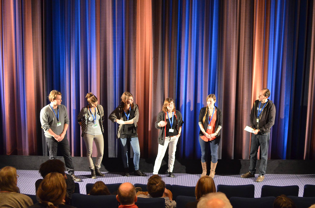 Produzent Dario Schoch, Tonfrau Manaledi La Roche, Kamerafrau Gabriela Betschart, Editorin Natascha Cartolaro, Regisseurin Valerie Blankenbyl, Festivalmoderator Piet Fuchs.